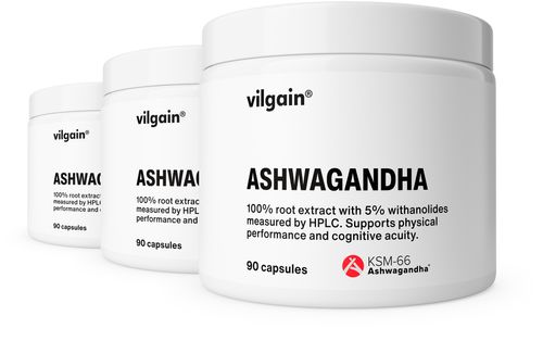 Ashwagandha has its roots in Ayurveda, where it has been used for thousands of years. In India, it is the most widely used herb used mainly for immunity support. Today's research, however, studies it mainly for contributing to mental and cognitive function, relaxation and supporting the reproductive system. Vilgain delivers pure ashwagandha extract in an additive‑free vegan cellulose capsule.
