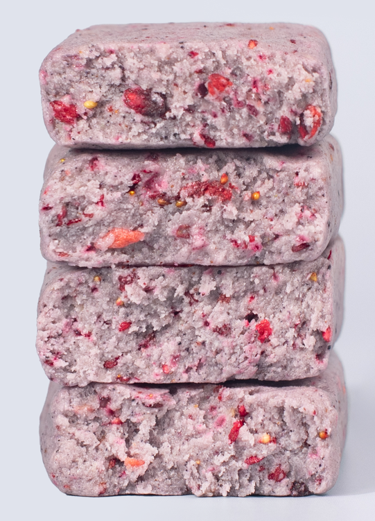 Milk protein 32%, prebiotic fibre from tapioca 18%, almonds blanched roasted, coconut syrup*, chicory fibre, freeze‑dried forest fruits(raspberries, strawberries) 4 %, humectant: glycerol, cocoa butter*, freeze‑dried blueberries 2 %, butterfat* (milk).