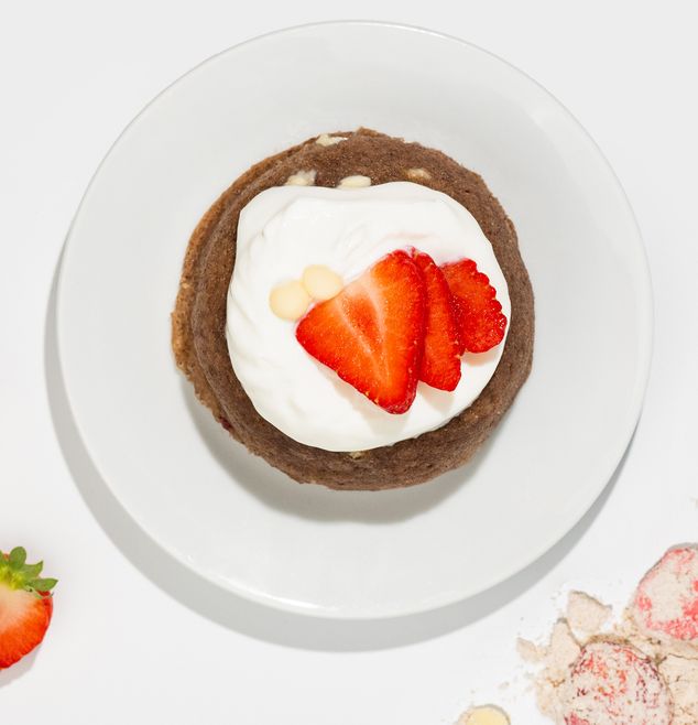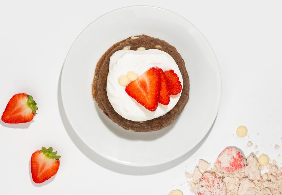Milk protein 28%, gluten‑free oat flour, almond flour, cane sugar, white chocolate choco chips (sugar, cocoa butter 33%, whole milk powder, emulsifier: rapeseed lecithin, bourbon vanilla) 11%, freeze‑dried strawberries %, coconut milk powder*, raising powder* (corn starch*, raising agents: potassium tartrates, sodium carbonates), ground vanilla, sea salt.